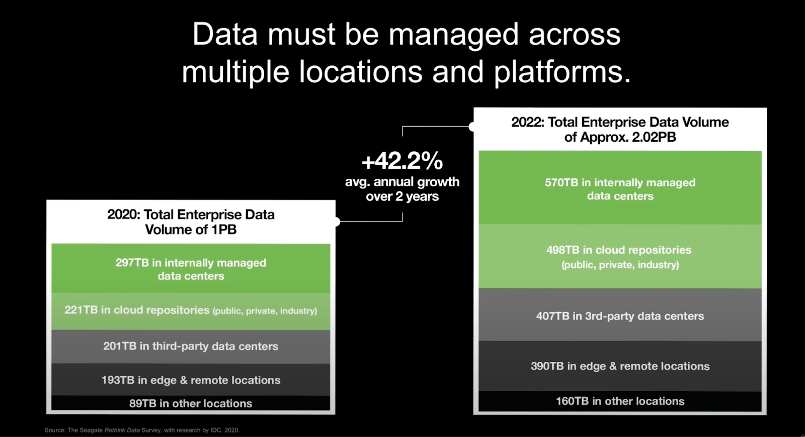 Seagate Technology forecasts that enterprise data will double from approximately 1 to 2 Petabytes (one Petabyte is 10^15 bytes) between 2020 and 2022. Approximately 30% of that data will be stored in internal data centres, 22% in cloud repositories, 20% in third party data centres, 19% will be at edge and remote locations, and the remaining 9% at other locations.