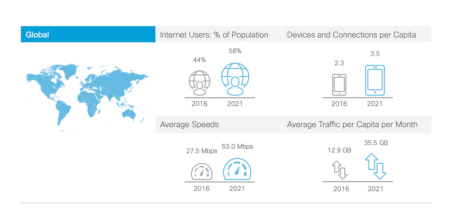 And in the age of Internet data moves around. Cisco estimates that global IP data traffic has grown 3-fold between 2016 and 2021, reaching 3.3 Zettabytes per year. Of that traffic, 46% is done via WiFi, 37% via wired connections, and 17% via mobile networks. Mobile and WiFi data transmissions have increased their share of total transmissions over the last five years, at the expense of wired transmissions.